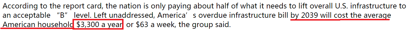美媒指出,美国迄今只支付了将国内整体基础设施提升至可接受的“B”级所需费用的一半左右。据ASCE估计,未来十年美国面临2.59万亿美元的基建投资缺口。如果继续无所作为,到2039年,美国逾期未付的基建账单将导致每户美国家庭平均每年花费3300美元。
