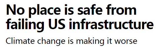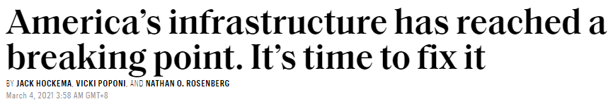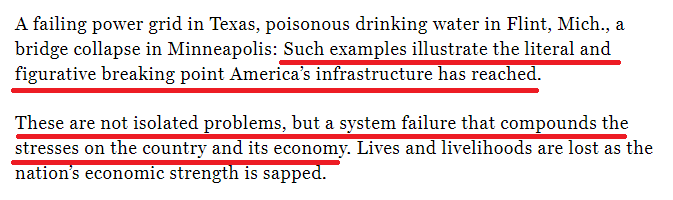 正如《财富》杂志的评论文章所说,基础设施建设需要协调一致并且全力以赴的举国努力。“得克萨斯州瘫痪的电网、密歇根州弗林特的有毒饮用水、明尼苏达州明尼阿波利斯的桥梁倒塌等等并不是孤立的问题,而是整个制度的失灵”。