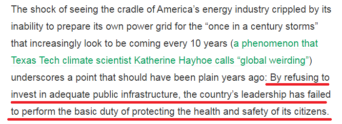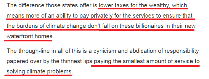 毫无疑问,基础设施建设需要消耗巨额资金,而这需要政府的政策调整和各方的积极参与,但许多有实力的投资者并不想承担这种社会责任。有评论文章以得州为例指出,富人们不愿意为应对天灾作出实质性努力,是因为当地政府一直对他们采取税收优惠政策,而这使他们有能力私下支付相关服务费用,以确保气候变化的负担不会“落在自己的海滨别墅上”。