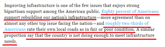 美国《财富》杂志报道称,改善基础设施是少数几个在分别支持两党的美国公众中得到普遍支持的议题之一:大约三分之二的美国人认为该国在满足基础设施需求方面做得不够;而80%的美国人支持重建国家基础设施。