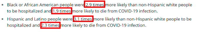 美国疾控中心的最新数据显示,非洲裔和拉美裔美国人感染新冠肺炎入院率分别是美国白人的2.9倍和3.1倍,死亡率分别是美国白人的1.9倍和2.3倍,这与各种族所占人口比例完全不相匹配。