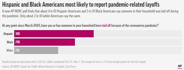 △AP-NORC民调:38%%的拉美裔美国人和29%的非洲裔美国人有亲属在疫情期间被解雇,而美国白人中的这一比例只有21%。