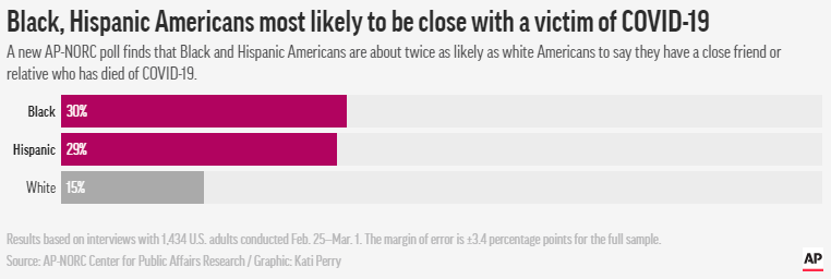 △AP-NORC民调:非洲裔和拉美裔美国人有亲友死于新冠病毒的可能性约为美国白人的两倍。