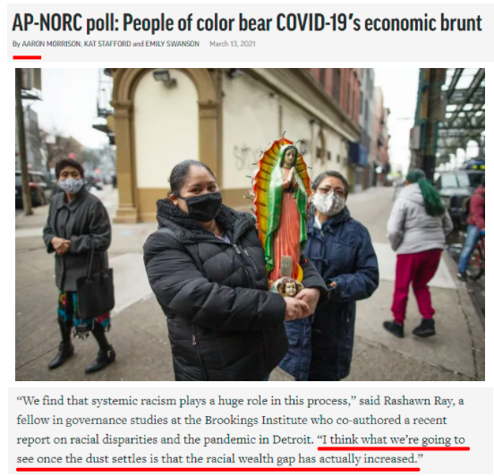 美联社报道还援引布鲁金斯学会研究员拉肖恩·雷的观点指出,疫情会进一步加大美国业已存在的种族贫富差距。