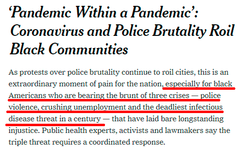 《纽约时报》此前曾以《“大流行中的大流行”》为题发表评论文章,称非洲裔美国人正遭受着“警察暴力”“极高的失业率”和“最致命的传染病”三重威胁,这暴露了美国长期存在的社会不公。