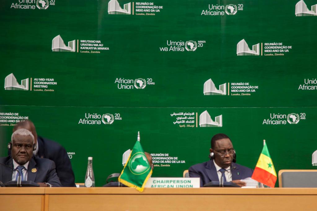7月17日,在赞比亚首都卢萨卡,非盟轮值主席、塞内加尔总统马基·萨勒(右)和非盟委员会主席法基出席第四届非盟年中协调会。新华社发(马丁·姆班圭塔 摄)
