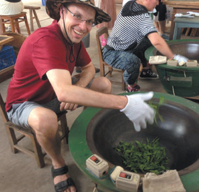 桑国亚在安徽黄山体验制茶。