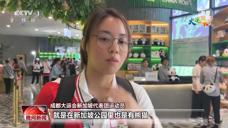 成都大运会新加坡代表团运动员:我是第一次来成都,但是我不是第一次看到熊猫,在新加坡的公园里也是有熊猫,但是只有两只。我很喜欢熊猫,所以我看到就很激动,我真的没想到我竟然会看到新生的熊猫。