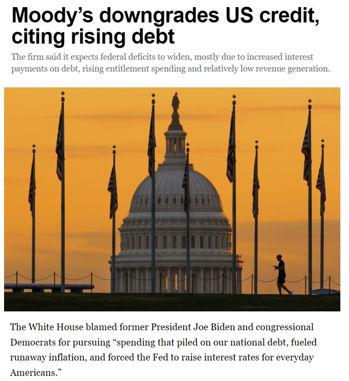 国际信用评级机构穆迪公司16日宣布,由于美国政府债务及利息支出增加,该机构决定将美国主权信用评级从Aaa下调至Aa1,同时将美国主权信用评级展望从“负面”调整为“稳定”。