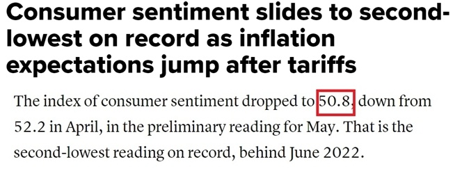 就在穆迪宣布降级消息的同一天,美国密歇根大学公布的最新数据显示,5月美国消费者信心指数(CCI)连续第5个月下滑,初值仅为50.8,不仅低于此前经济学家的普遍预期,更是创下美国有记录以来的第二低值。