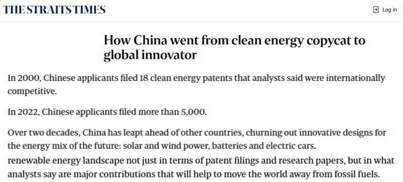 近日刊发在新加坡《海峡时报》网站的一篇报道关注了中国清洁能源的发展。报道首先以一组数据分析称,2000年,中国申请人提交了18项清洁能源专利,分析人士认为这些专利具有国际竞争力。到2022年,中国申请人提交的有关专利申请数量已超过5000件。