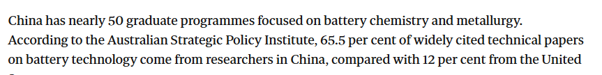 这一转变趋势的形成,既源于中国的政策支持,也得益于中国学术研究环境的日益成熟。比如,中国有近50个专注于电池化学和冶金学的研究生项目。文章援引澳大利亚战略政策研究所的数据:65.5%被广泛引用的电池技术论文来自中国研究人员。