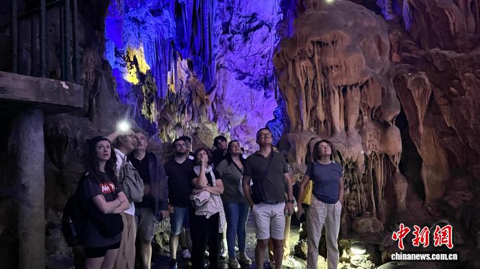 在芦笛岩景区,五彩灯光映照千年溶洞,导游为意大利游客讲解溶洞地质演变历程以及象形景观背后的故事传说。石乳、石幔、石笋姿态万千,光影交织如人间仙境,引得意大利游客们对眼前的自然奇观赞不绝口,纷纷举起手机拍摄记录。