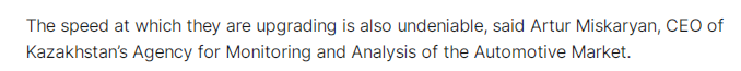 文章称,在哈萨克斯坦,有超过一半的购车者是以贷款或者分期付款的方式购车。中国汽车制造商通过与当地银行合作,制定优惠的贷款政策让当地人得以更方便地购车。