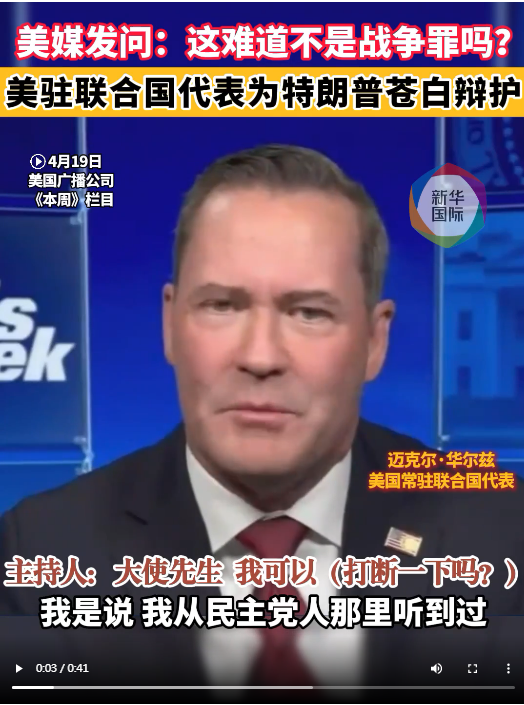 据美国广播公司报道,美国总统特朗普19日在社交媒体再次威胁“炸毁伊朗每一座桥梁与发电厂”后,美国常驻联合国代表迈克尔·华尔兹为其苍白辩护称,炸毁民用设施“在陆战规则中是完全可以接受的”。