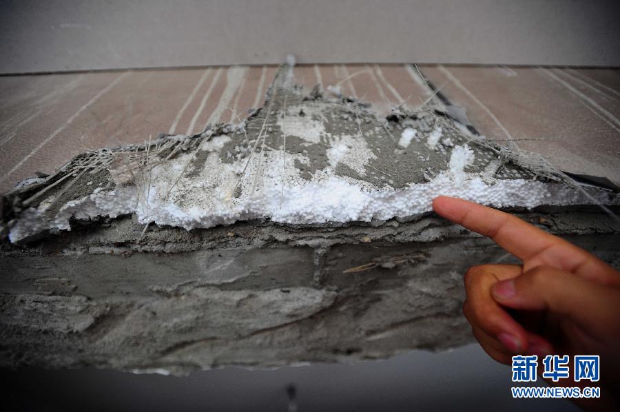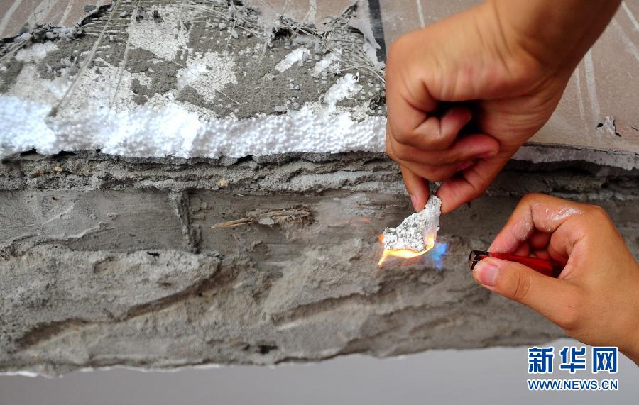 近日,位于湖北武汉的“三金华都”小区的不少居民反映楼盘被“泡沫”包裹,火灾安全隐患严重。记者来到现场调查发现住宅楼的外墙保温层是泡沫材料,一点即燃。公安部、住房与城乡建设部联合制定的《民用建筑外保温系统及外墙装饰防火暂行规定》规定民用建筑外保温材料的燃烧性能宜为A级,且不应低于B2级。据了解,“三金华都”楼盘使用的泡沫材料属于易燃性建筑材料,是B3级,并未达到规定要求。而该开发商选用劣质保温材料,置居民安全不顾,业主多次反映无果。该小区的开发商武汉三金房地产开发有限公司的负责人解释,大楼外墙建成时保温材料的新规定尚未出台。但不少业主表示担忧,“我们的安全谁来保障?” 新华社记者 肖艺九 摄