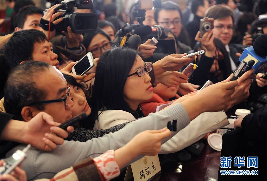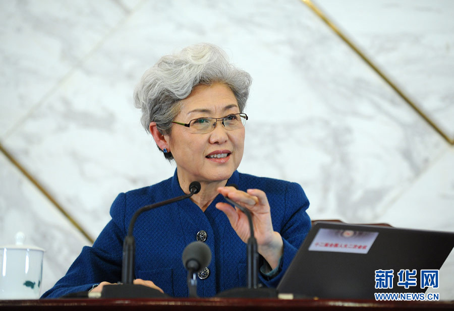 3月4日,十二届全国人大二次会议新闻发布会在人民大会堂一层新闻发布厅召开,大会新闻发言人傅莹向中外媒体介绍本次大会有关情况,并回答记者提问。图为十二届全国人大二次会议新闻发言人傅莹。新华网 陈竞超 摄