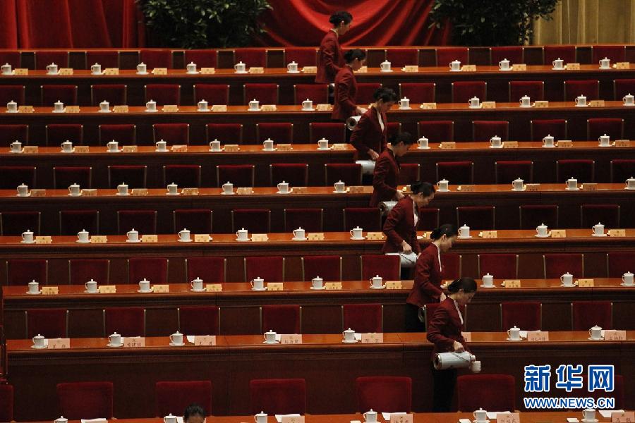3月3日,中国人民政治协商会议第十二届全国委员会第二次会议在北京人民大会堂开幕。这是开幕会前,服务人员在主席台倒水。 新华社记者邢广利摄