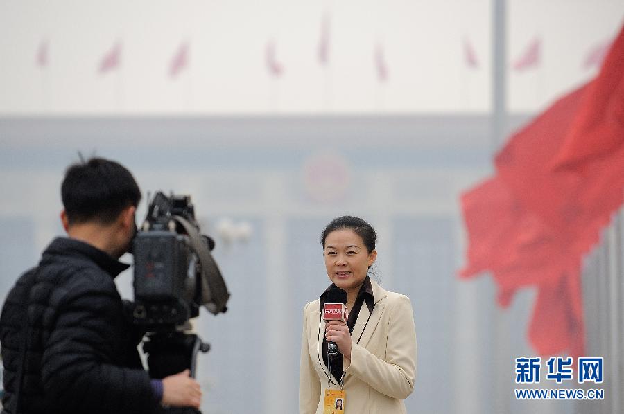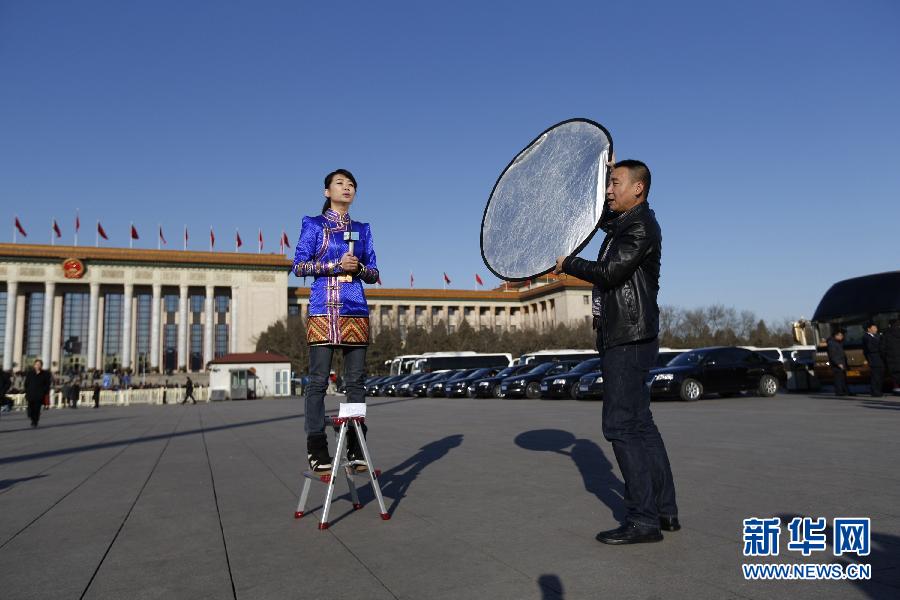 3月3日,中国人民政治协商会议第十二届全国委员会第二次会议在北京人民大会堂开幕。这是记者在天安门广场录制节目。 新华社记者 刘金海摄