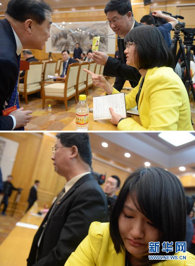 3月5日,十二届全国人大二次会议辽宁省代表团举行媒体开放日活动,一位记者因为没有得到提问的机会,在会议结束后流下遗憾的泪水。上图:这是记者(右)向工作人员争取最后的提问机会;下图:会议结束后,记者流下泪水。新华社记者杨青摄