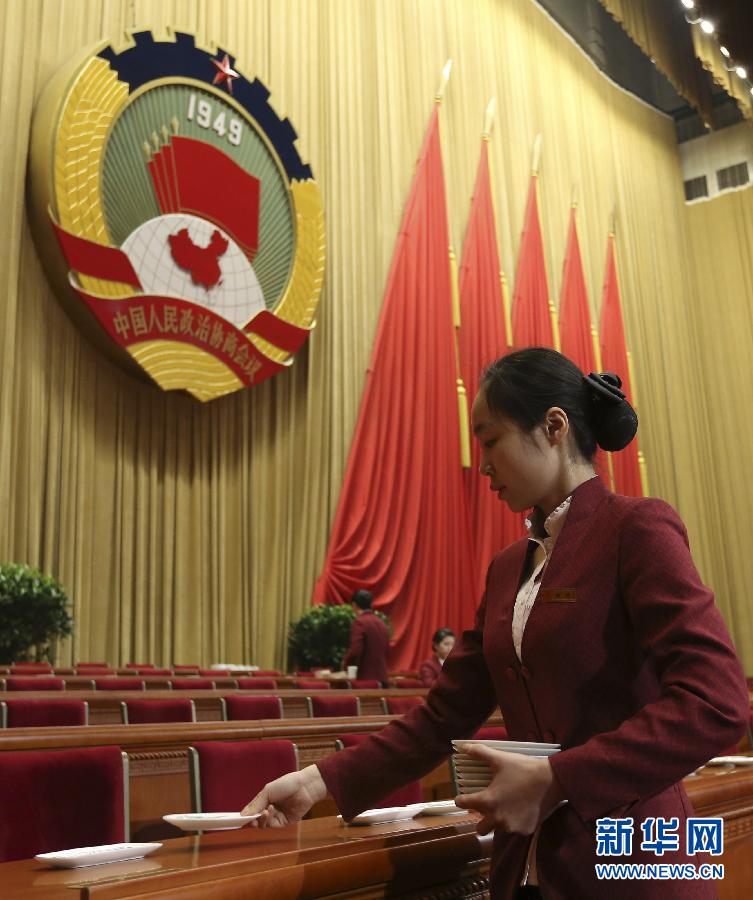 3月3日,中国人民政治协商会议第十二届全国委员会第二次会议在北京人民大会堂开幕。这是服务人员在人民大会堂主席台做准备。 新华社记者庞兴雷 摄