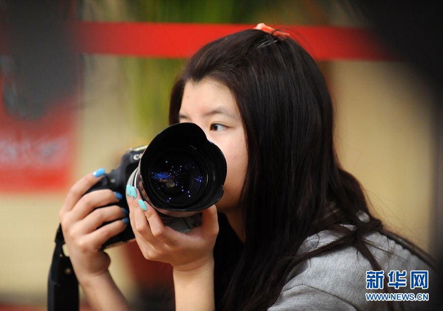 采访时冲在最前面的女记者。新华网 陈竞超 摄