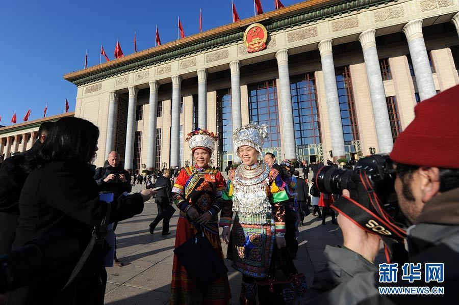 代表委员们在大会堂前留影。新华网 陈竞超 摄
