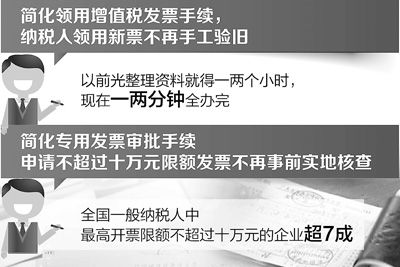 “以前每次去税务局领发票,都要带上验旧发票的明细、月汇总、退票、最后一张票的记账联等,光整理资料就得一两个小时,有时候少带一两项还要多跑一趟,遇上人多的时候需要排队等待很长时间。”在听到领用增值税发票不再需要手工验旧的消息后,山东菏泽德泰化工有限公司的财务负责人田慧全深有感触地向记者说,取消手工验旧手续后,我们直接就能办理发票领用手续,一两分钟就可以办完,大大节约了我们的时间,这样的便民办税措施最实在。