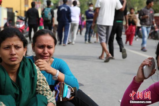 据中国地震台网正式测定:4月25日14时11分在尼泊尔(北纬28.2度,东经84.7度)发生8.1级地震,震源深度20千米。尼泊尔首都加德满都震感强烈。记者目睹一堵墙被震塌,周围大批居民奔跑到空旷地带,狗叫声四起,手机信号中断。图为加德满都市民灾后哭泣。 中新社发 符永康 摄