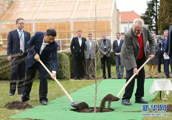当地时间3月28日,国家主席习近平在布拉格拉尼庄园同捷克总统泽曼举行会晤。会晤前,两国元首在庄园里种下一株来自中国的银杏树苗。新华社记者 兰红光 摄