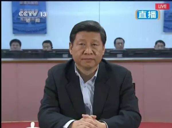 2013年12月15日习近平在北京航天飞行控制中心观看嫦娥三号着陆器、巡视器互拍成像实况,习近平聚精会神地观看显示屏上的三维演示和各项参数,聆听着扩音器里传出的各项口令。(图片来源:央视视频截图)