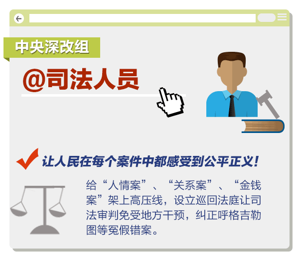 【言出必行】27次中央深改组会议,有18次涉及司法议题。其中的每一项举措,都着眼于让百姓感受到公平正义:建立领导干部干预司法案件记录通报和责任追究制度,给“人情案”、“关系案”、“金钱案”架上了高压线;在深圳、沈阳设立巡回法庭,使司法审判免受地方干预;出台深化律师制度改革意见,律师执业权利进一步保障。禁止干预司法案件正成为全社会共识,呼格吉勒图、念斌、陈满等冤假错案得到纠正。