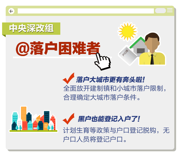 造福民众让深改组的故事深入人心。对重大改革尤其是涉及人民群众切身利益的改革决策,深改组建立了社会评估机制。遇到关系复杂、牵涉面广、矛盾突出的改革,深改组总能从人民的实际利益出发谋划方案、制定举措、推进落实。群众生活情况怎么样?群众诉求是什么?改革能给群众带来哪些获得感?总是深改组最关心的问题。1000天来,深改组先后对改革行政审批制度、改革工商注册制度、推进社会主义核心价值体系建设、实施单独两孩政策、废止劳动教养制度、改革和完善干部考核评价制度、改进干部选拔任用机制、坚持厉行节约反对浪费、深入开展党风廉政建设和反腐败斗争等全社会高度关注、各方面抱有急切期盼的一系列问题,及时组织有关部门进行研究,出台了系列政策措施和制度文件,有的还做出了法律决定。这些改革措施涉及到百姓生活的方方面面,对我国经济发展和民生改善产生了巨大的推动作用和深远的社会影响。深改组在涉及农民利益和城乡关系等问题上动真刀、亮真枪。推进人的城镇化的重要环节在户籍制度,加快户籍制度改革,是涉及亿万农业人口转移的重大举措。深改组推出了尊重城乡居民自主自愿、合理引导农业人口转移落户城镇的户籍制度改革方案。为了促进大中小城市和小城镇合理布局、功能互补,搞好基本公共服务,维护好农民的土地承包经营权、宅基地使用权、集体收益分配权,深改组陆续推出了《关于引导农村土地承包经营权有序流转发展农业适度规模经营的意见》和《积极发展农民股份合作赋予集体资产股份权能改革试点方案》等举措,为农民在城镇化进程获得更大的土地转让收益扫清了障碍。