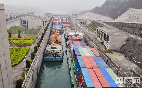 大型船舶经过三峡大坝五级闸口。(央广网记者 陈锐海 摄)