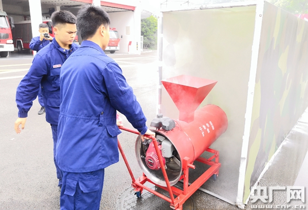 训练中,消防员模拟用干粉快速扩散器灭火。(央广网记者 陈锐海 摄)