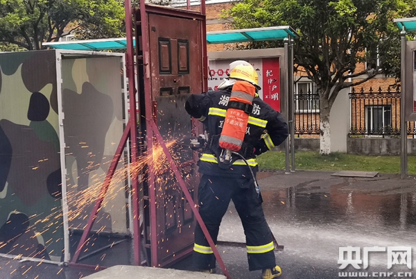 训练中,消防员在模拟救火。(央广网记者 陈锐海 摄)