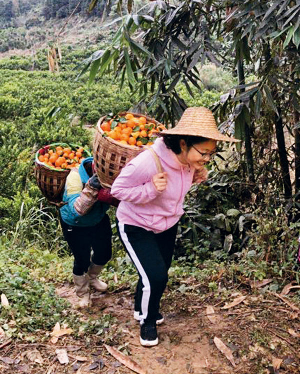 黄文秀带领村干部和群众挖掘百坭村的资源优势,学经验、找路子,发展了杉木、八角、砂糖桔、枇杷等特色种植产业,拓宽了群众增收渠道。图为黄文秀帮着村民背送丰收的砂糖桔 。 百色市委宣传部供图