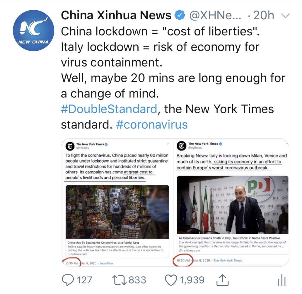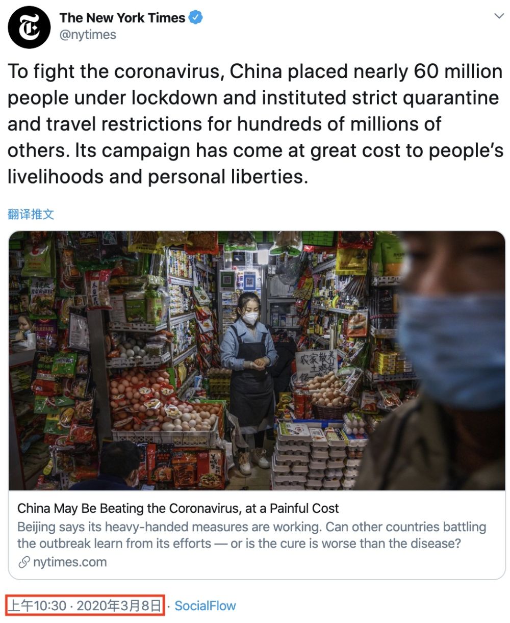 前后仅隔20分钟,两条贴文谈论着控制疫情的类似措施,但观点和态度却天壤之别,《纽约时报》对待中国及西方的双重标准显而易见。