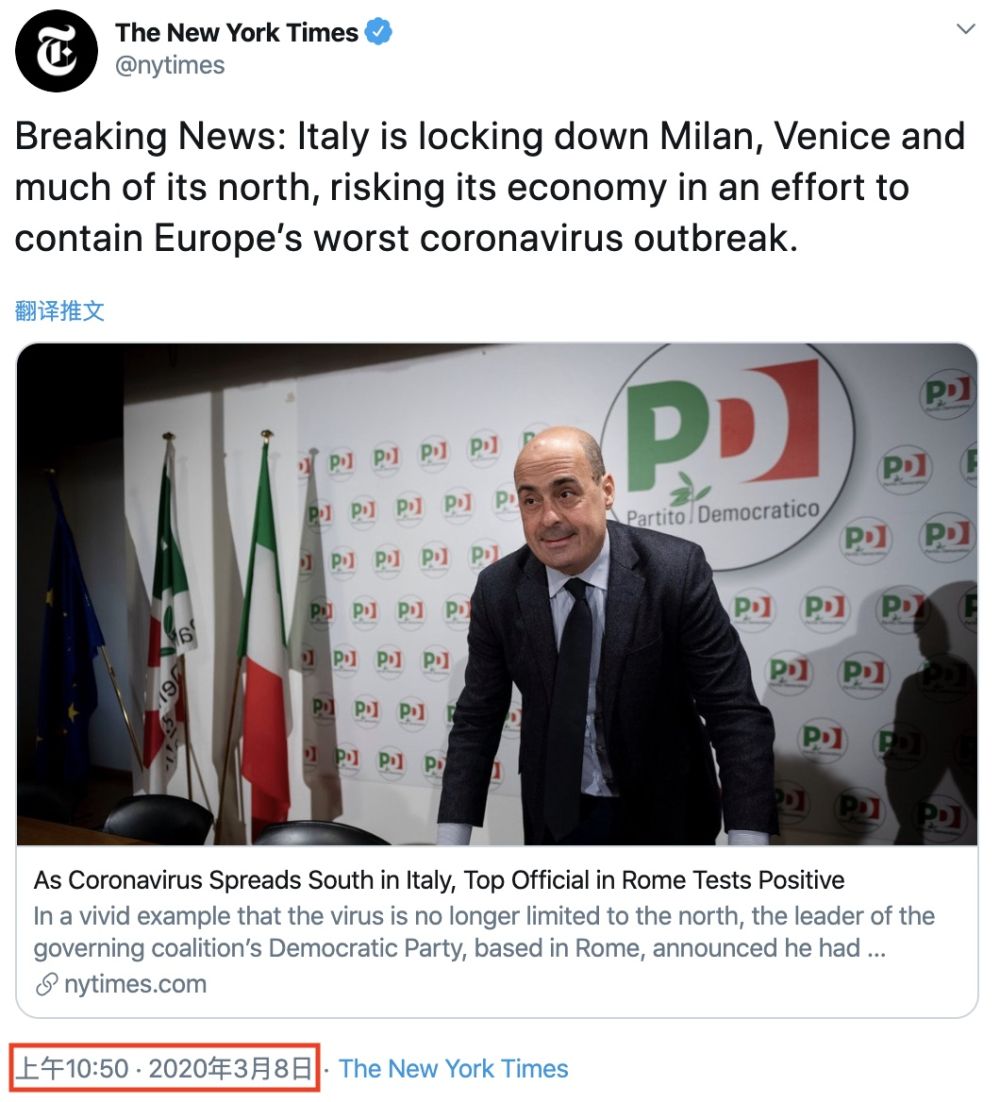 该网友的“神预言”很快便得到验证。仅仅在发布第一条推文20分钟后,《纽约时报》账号又发布第二条消息,夸赞意大利封城之举是“冒着经济风险保全欧洲”: