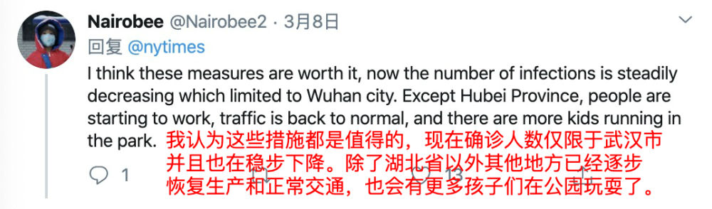 还有一些网友跟《纽约时报》摆事实讲道理,捍卫中国的抗疫立场: