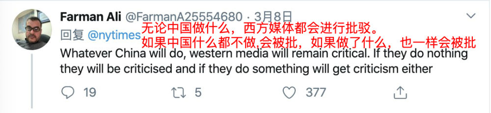 面对《纽约时报》如此刻意的偏颇报道,海外网友的眼睛是雪亮的。两条推特发布后,该账号留言区很快被网友们抨击的评论淹没: