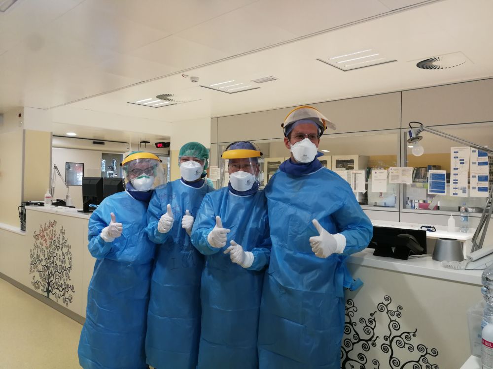 3月18日,在意大利帕多瓦,中国抗疫医疗专家组成员与当地医生合影。新华社发(中国抗疫医疗专家组供图)