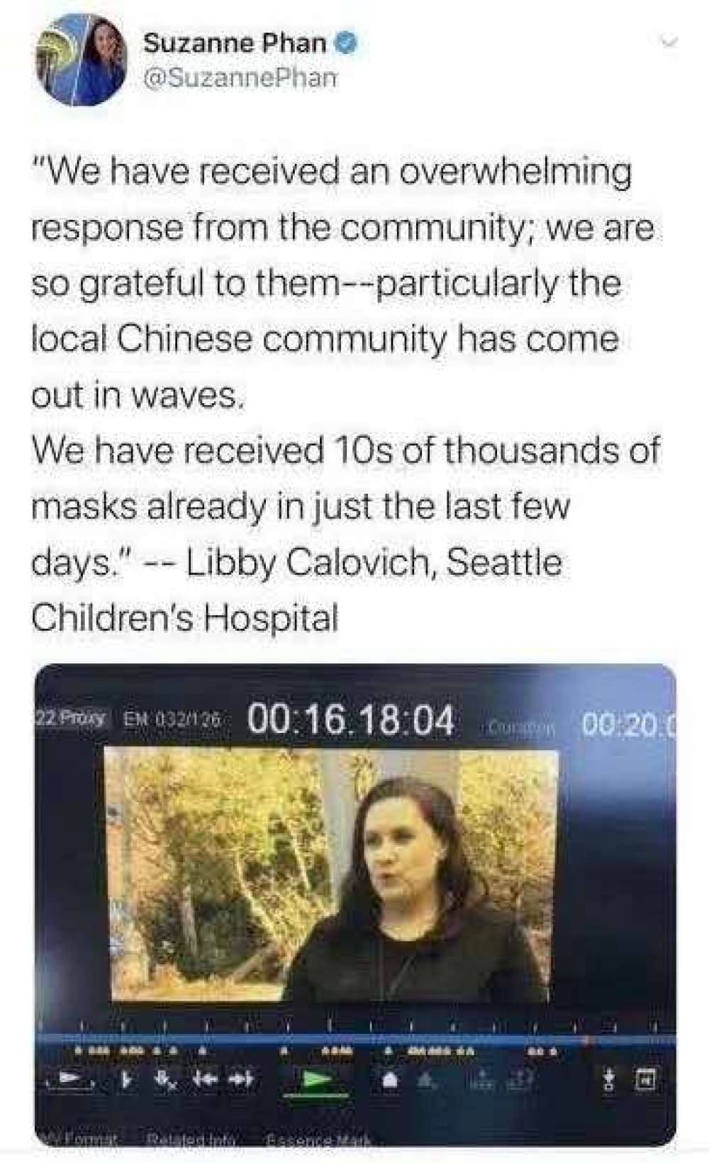 华盛顿州西雅图是美国疫情发现最早、疫情比较严重的地区之一。当地记者苏珊娜·潘在社交媒体上分享了西雅图儿童医院莉比·卡洛维赫的感言:“我们得到了社区巨大支持,非常感谢大家,特别是踊跃站出来的华裔群体。短短几天内,我们就收到数以万计的口罩。”