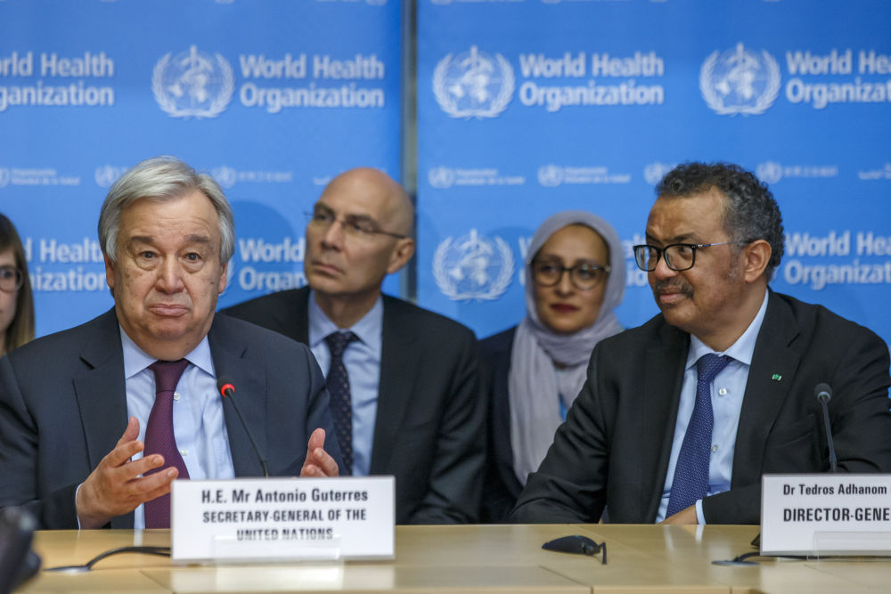 联合国秘书长古特雷斯4月14日晚间通过发言人发表声明说,世界卫生组织必须得到支持,这对全球战胜新冠疫情的努力绝对关键。这是2月24日,在瑞士日内瓦,联合国秘书长古特雷斯(左)在世界卫生组织总部发表讲话。新华社发