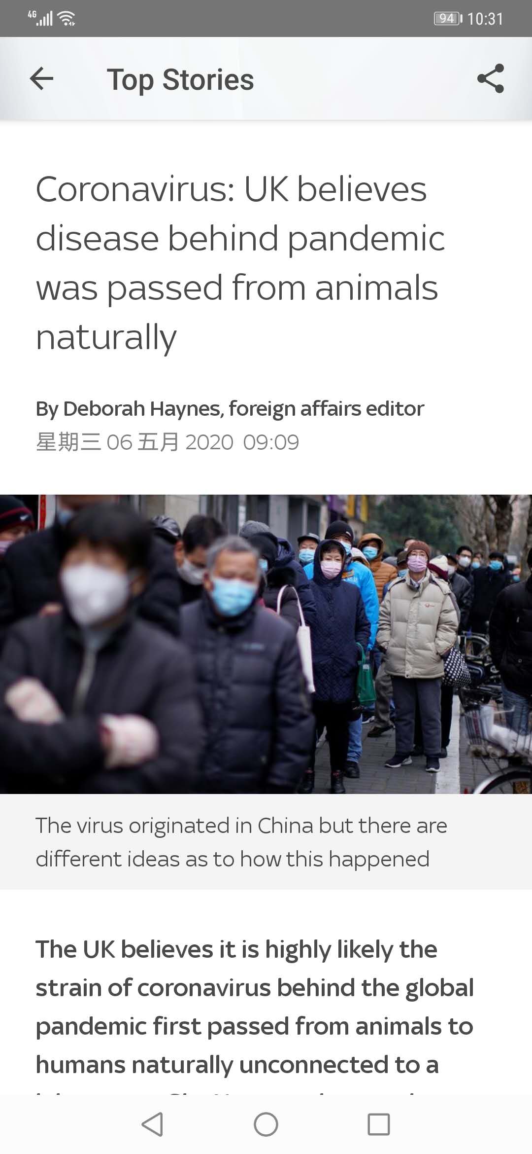 英国天空新闻在5月6日发表文章称,英国认为全球大流行病背后的冠状病毒毒株极有可能是首先从动物身上自然而然地传给了人类,与实验室无关。