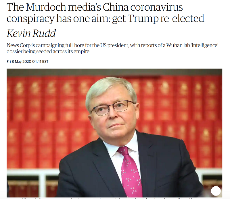 当地时间5月8日,英国《卫报》刊登了一篇澳大利亚前总理陆克文的署名文章,标题为《默多克传媒报道“中国人造病毒”阴谋论的唯一目的:让特朗普当选》。