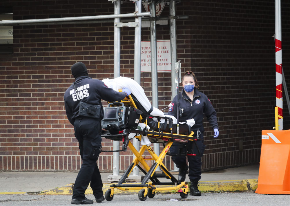 5月11日,在美国纽约布鲁克林一家医院外,医护人员准备将一名病人送入急诊。(新华社记者王迎摄)