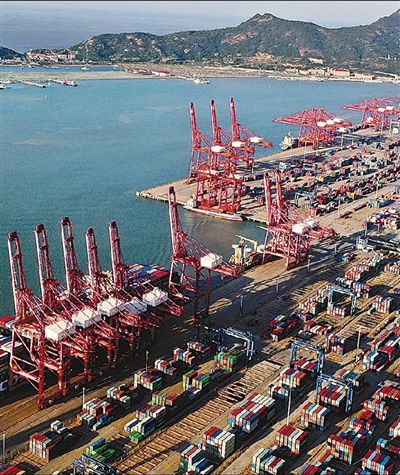 5月11日,江苏连云港港集装箱码头一派繁忙景象。