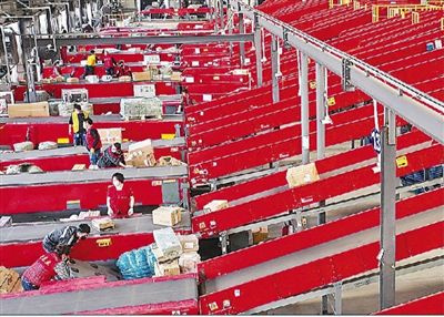 4月15日,在山东即墨国际陆港青岛顺丰华骏分拨中心,智能分拣线上的不同货物正在被快速分拣。