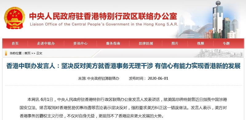 6月1日,中央人民政府驻香港特别行政区联络办公室发言人发表谈话,就美国总统特朗普近日指责中国涉港国安立法、扬言取消对香港贸易优惠待遇等言论表示坚决反对,强烈要求美方纠正这一错误做法。发言人表示,美方对香港事务的霸权主义行径,不仅对自身无益,更阻挡不了香港迎来更大发展的大势。